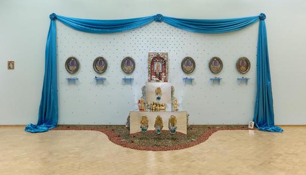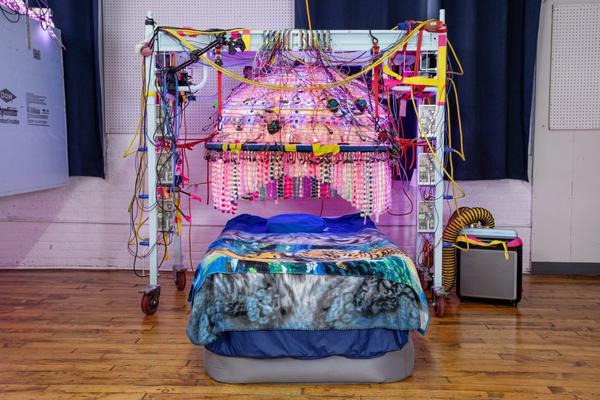 Neon glows from the wood-trim parlor of the Newport Art Museum, shining from a large pitch tent studded with antennae and LED strips, distorted and enlarged by the narrow walls that surround it. Two visitors, strangers to one another and perhaps themselves, slip off their shoes before pulling back the tent’s beige curtains to reveal a cushy rainbow field of luminescent pom-pom polka dots, the unmistakable backdrop of Bobby Anspach’s Place For Continuous Eye Contact (Tent) (2025, edition 1 of 3)....